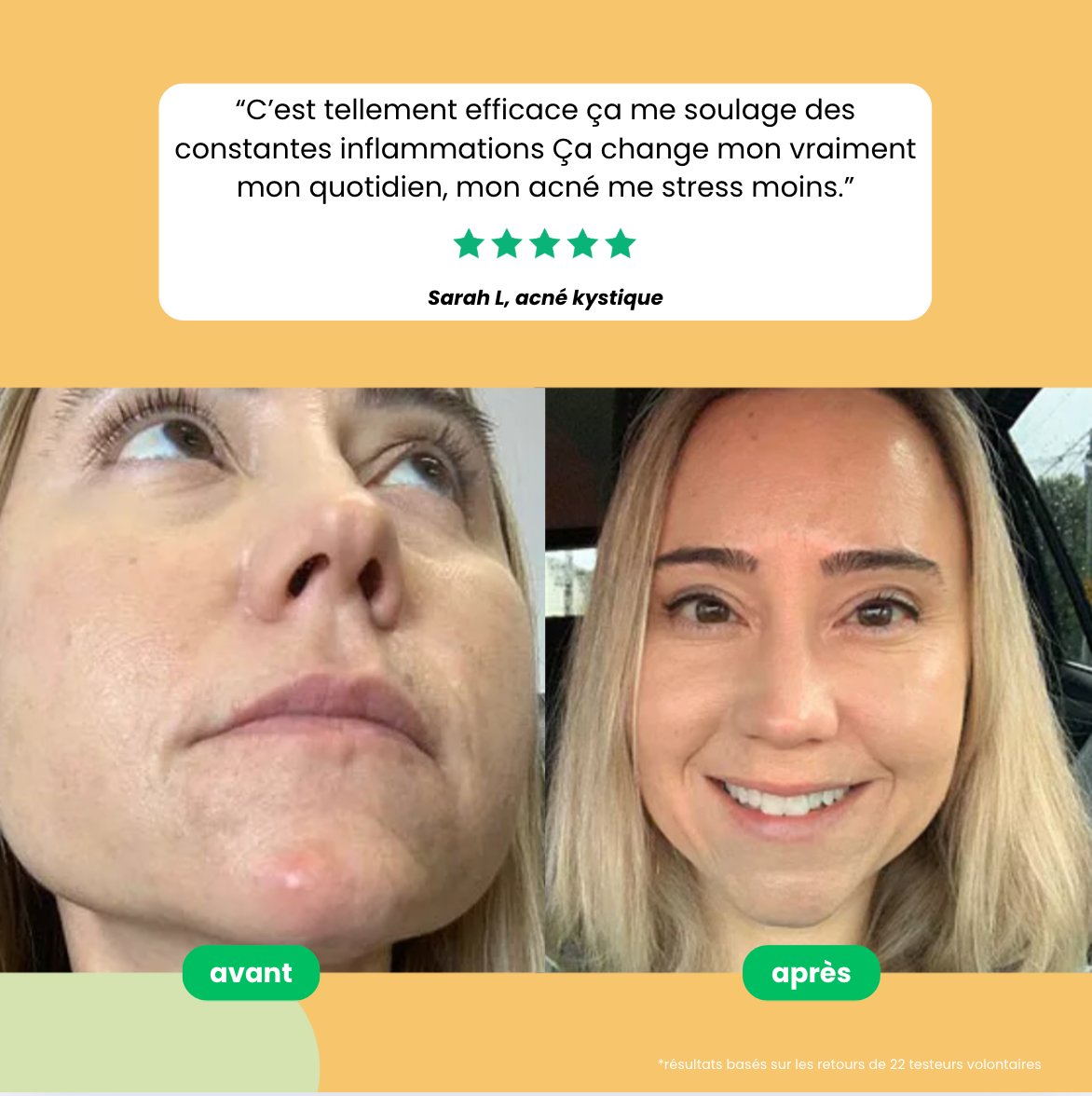Pensé pour les peaux sujettes à l'acné tenace, au stress cutané, acné hormonale, ou à des déséquilibres liés aux hormones SPM ou SOPK.