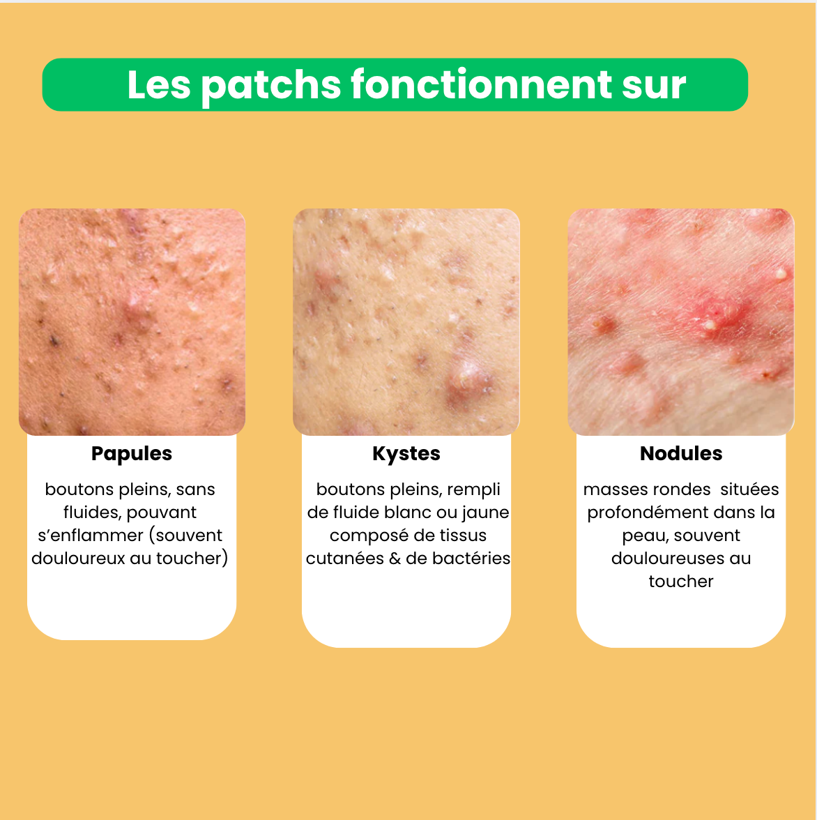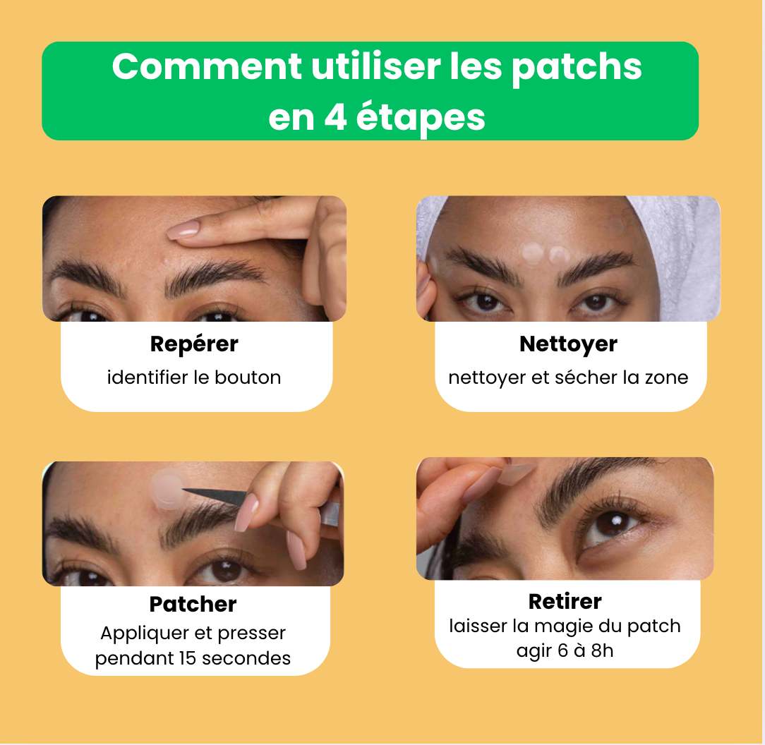 Un seul patch suffit : grâce à sa formule ultra-puissante, il agit en seulement 6h. Pour de meilleurs résultats, portez-le pendant la nuit et réappliquez-le si nécessaire. Si le bouton est très en profondeur il peut être necessaire d'utiliser 2 patchs, pour le faire remonter à la surface et prêt à sortir.