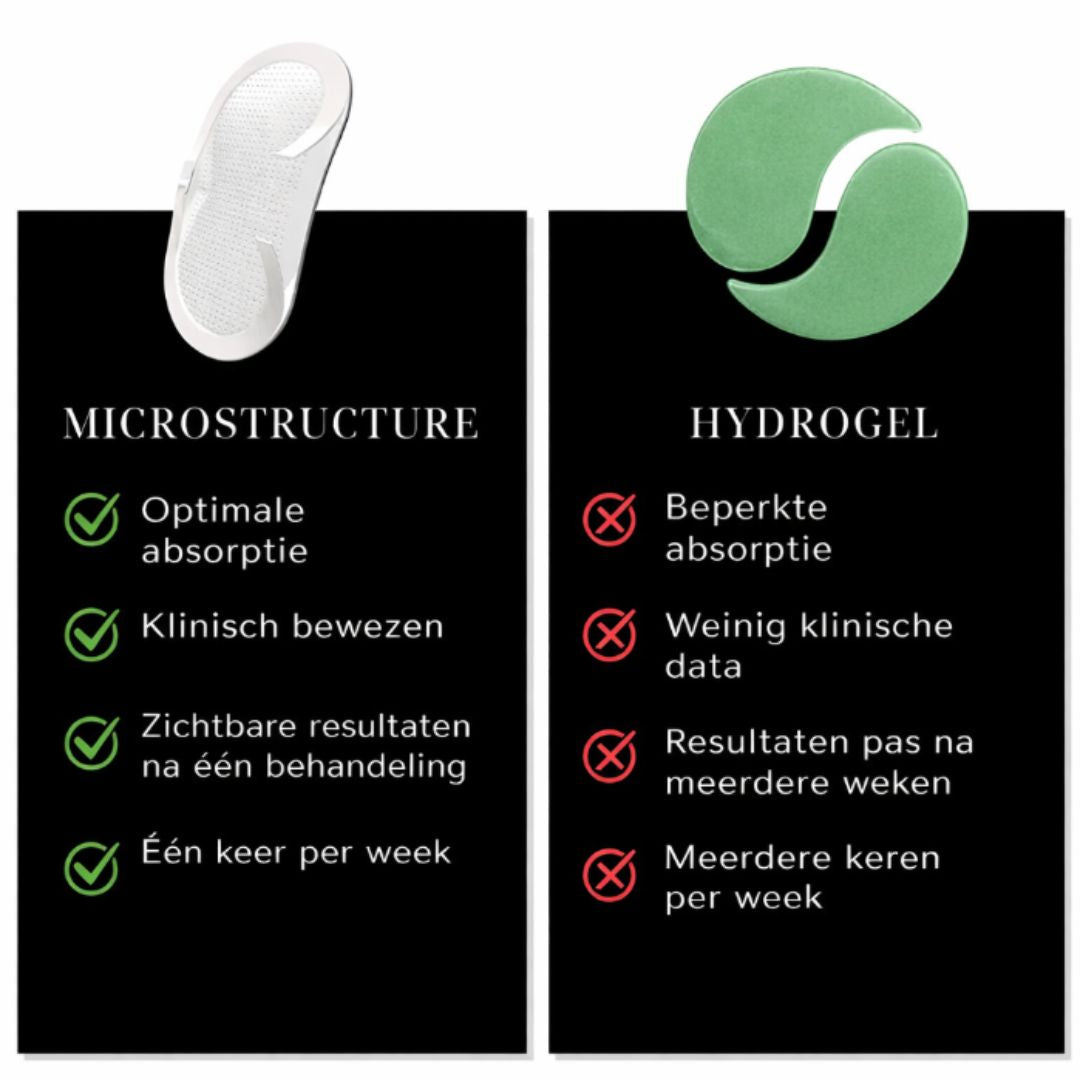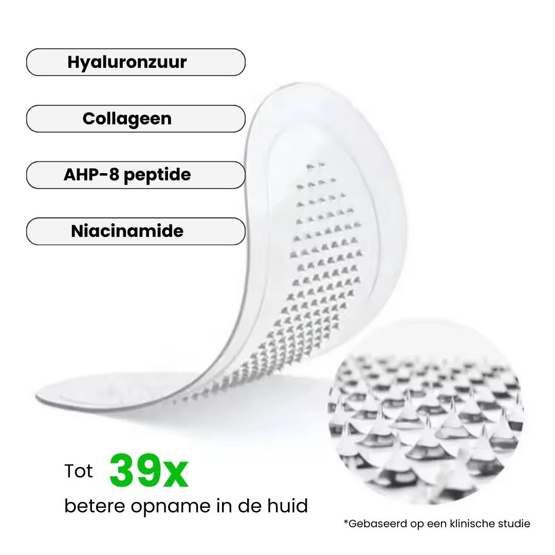 De microstructuur van onze patches bestaat uit micronaaldjes die in de huid oplossen. Bij het aanbrengen lossen deze micronaaldjes op en geven ze actieve ingrediënten diep in de huid af, waardoor een optimale opname van de actieve stoffen wordt gegarandeerd voor zichtbare en langdurige resultaten.
